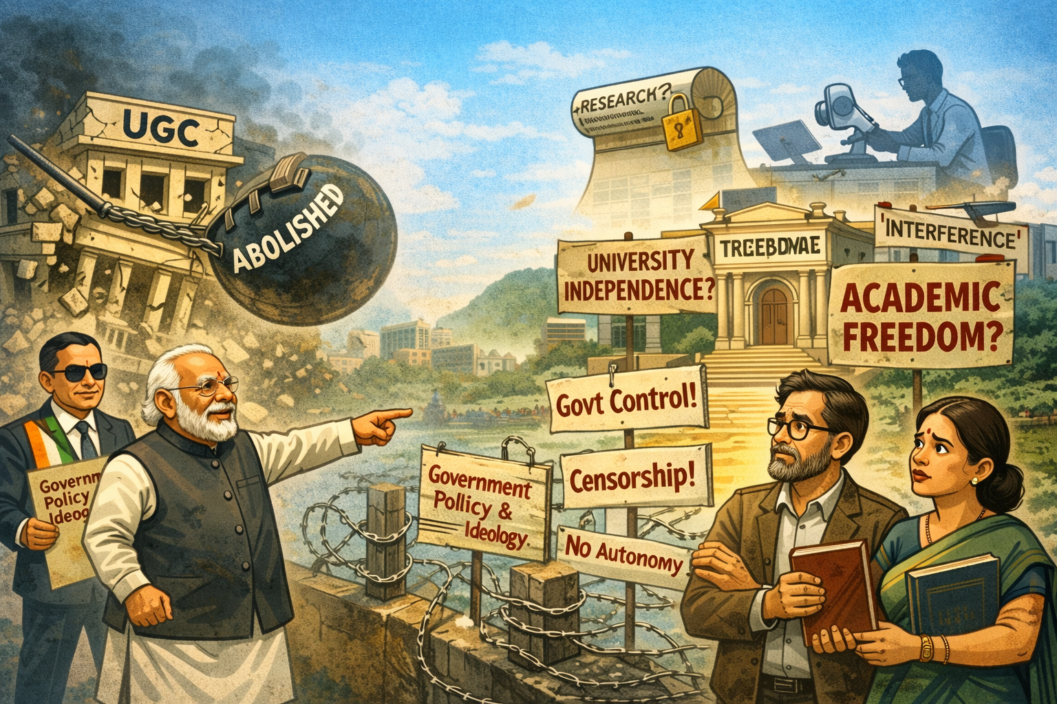 দেশের উচ্চশিক্ষা ব্যবস্থার মেরুদণ্ড বলে পরিচিত বিশ্ববিদ্যালয় মঞ্জুরি কমিশন বা ইউজিসি বাতিল করার সিদ্ধান্ত শুধু একটি সংস্থা তুলে দেওয়ার ঘোষণা নয়, এটি আসলে স্বাধীন ও সমালোচনামূলক শিক্ষাব্যবস্থার উপর সরাসরি আঘাত। ইউজিসি মানেই শুধু অর্থ বরাদ্দ নয়, ইউজিসি মানে ছিল ন্যূনতম মানদণ্ড, স্বশাসন এবং রাজনৈতিক হস্তক্ষেপের বিরুদ্ধে একটি প্রাতিষ্ঠানিক ঢাল। সরকারের দাবি, নতুন কাঠামো নাকি 'সংস্কারমূলক','সরলীকরণ'-এর অংশ। কিন্তু অভিজ্ঞতা বলছে, মোদি সরকারের এই তথাকথিত সংস্কারের অর্থ একটাই-কেন্দ্রের নিয়ন্ত্রণ বাড়ানো, ভিন্নমত দমন করা এবং স্বশাসিত প্রতিষ্ঠানগুলিকে অনুগত দপ্তরে রূপান্তরিত করা। নীতি আয়োগ তার প্রকৃষ্ট উদাহরণ। পরিকল্পনা কমিশনের যে জায়গায় যে প্রতিষ্ঠান এলো, তার কোনও সাংবিধানিক ক্ষমতা নেই, কিন্তু কেন্দ্রের নির্দেশ মানতে রাজ্যগুলিকে বাধ্য করার এক অদৃশ্য হাত সেখানে সবসময় সক্রিয়। ইউজিসি তুলে দিয়ে যদি একই ধরনের 'কেন্দ্রীয় সুপারভাইজরি বডি' তৈরি হয়, তাহলে প্রশ্ন উঠবে-বিশ্ববিদ্যালয়ের স্বাধীনতা কোথায়? গবেষণার স্বাধীনতা কোথায়? উচ্চশিক্ষা কি তবে পুরোপুরি সরকারের নীতি ও আদর্শের মুখাপেক্ষী হয়ে পড়বে? সবচেয়ে উদ্বেগজনক বিষয়, এই ধরনের মৌলিক সিদ্ধান্ত নেওয়া হচ্ছে কোনও বিস্তৃত জাতীয় আলোচনা ছাড়া। সংসদে পূর্ণাঙ্গ বিতর্ক নেই, শিক্ষাবিদদের মতামত নেই, রাজ্যগুলির সঙ্গে প্রকৃত পরামর্শ নেই। যেন প্রতিষ্ঠান গড়া বা ভাঙা কোনও কর্পোরেট বোর্ডরুমের সিদ্ধান্তমাত্র। স্বাধীনতার পর দেশ যে প্রতিষ্ঠানগুলি গড়ে তুলেছিল, সেগুলি ছিল শুধু প্রশাসনিক কাঠামো নয়, সেগুলি ছিল গণতন্ত্রের ভারসাম্য রক্ষাকারী স্তম্ভ। পরিকল্পনা কমিশন হোক বা ইউজিসি- এই সংস্থাগুলি সরকার বদলালেও রাষ্ট্রকে স্থিতিশীল রাখত। আজ একের পর এক সেই স্তম্ভভেঙে ফেলা হচ্ছে।২০১৪ সালের পর থেকে ভারতের শিক্ষা, প্রশাসন, সাংবিধানিক প্রতিষ্ঠান, সরকারী প্রকল্প একে একে হয় বাতিল করে নতুন ভাবে নির্মাণ করা হয়েছে অথবা নাম পরিবর্তন হয়েছে। সেই বদল তালিকায় যুক্ত হল মহাত্মা গান্ধী ন্যাশনাল রুরাল এমপ্লয়মেন্ট গ্যারান্টি স্কিম, তেমনই আবার উচ্চশিক্ষা নীতিরও কাঠামো বদলের জন্য নতুন আইন আনার প্রথম পদক্ষেপ গ্রহণ করল মোদি সরকার। চলতি সংসদ অধিবেশনে লোকসভায় পেশ করা হল, বিকশিত ভারত শিক্ষা অধিষ্ঠান বিল ২০২৫। বিলের লক্ষ্য-কেন্দ্রীয় বিশ্ববিদ্যালয়, কলেজ, উচ্চশিক্ষা প্রতিষ্ঠানগুলির বর্তমানে নিয়ন্ত্রক সংস্থাগুলিকে বাতিল করে দেওয়া। নতুন একটি কমিশন গঠন করা হবে। আর থাকবে তিনটি পৃথক কাউন্সিল। এটি কিন্তু ক্ষমতার বিকেন্দ্রীকরণ নয়। বরং আগামী দিনে কলেজ, বিশ্ববিদ্যালয়, উচ্চশিক্ষা প্রতিষ্ঠান পরিচালন