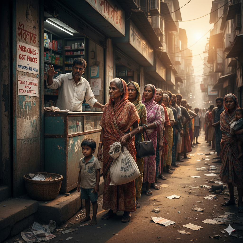 ওষুধ মানুষের বিলাস নয়, বাঁচার প্রয়োজন। সেই প্রয়োজনকে পুঁজি করে যদি এভাবে অতিরিক্ত মুনাফা তোলা হয় তা শুধু অনৈতিক নয়। অবশ্যই প্রতারণার শামিল।এই পরিস্থিতিতে প্রশ্ন উঠছে, রাজ্যের ড্রাগ কন্ট্রোল ও জিএসটি দপ্তরের নজরদারি কোথায়? কেন এই অনিয়ম রোখার জন্য অভিযান হচ্ছে না এবং কেন সাধারণ মানুষের অধিকার রক্ষা করা হচ্ছে না। সরকার যেখানে করছাড় দিয়ে মানুষের পাশে দাঁড়াতে চেয়েছে, সেখানেই সেই ছাড় যদি বাজারে না পৌছায় তবে সরকারের আসল উদ্দেশ্য ব্যর্থ হবে। এমন সমালোচনা এখন ঘুরছে সাধারণ মানুষের মুখে মুখে।