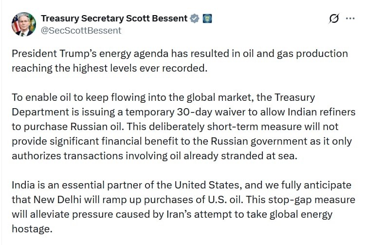 মার্কিন ট্রেজারি জানিয়েছে, এই অনুমতি সম্পূর্ণ অস্থায়ী এবং মূলত সমুদ্রে আটকে থাকা তেলের চালান নিষ্পত্তির জন্য দেওয়া হয়েছে। একই সঙ্গে ওয়াশিংটন স্পষ্ট করেছে, ভারত তাদের একটি গুরুত্বপূর্ণ কৌশলগত অংশীদার এবং ভবিষ্যতে ভারত যে আমেরিকা থেকে আরও বেশি জ্বালানি কিনবে-সে প্রত্যাশাও তাদের রয়েছে। অর্থাৎ সাময়িক ছাড়ের মধ্যেই ভবিষ্যতের কূটনৈতিক প্রত্যাশার ইঙ্গিত স্পষ্ট।