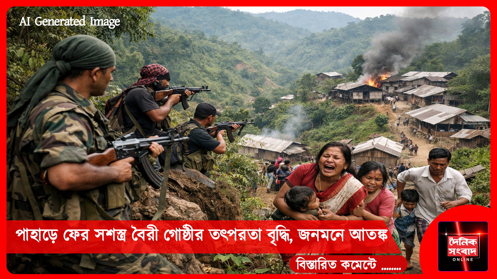 বর্তমানে পাহাড়ি গ্রামাঞ্চলে বিভিন্ন দলে ভাগ হয়ে বৈরীরা অর্থ সংগ্রহে নামার খবর পাওয়া যাচ্ছে। তবে যারা অর্থ সংগ্রহ করছে তারা প্রকৃত বৈরী গোষ্ঠীর সদস্য নাকি ভুয়া পরিচয়ে সক্রিয়- তা নিয়ে ধোঁয়াশা রয়েছে। দীর্ঘদিন শান্ত থাকার পর স্বশাসিত জেলা পরিষদ এবং ভিলেজ কাউন্সিল নির্বাচনের প্রস্তুতির মধ্যেই এই পরিস্থিতির উদ্ভব হয়েছে। ফলে নির্বাচনি প্রক্রিয়ার উপর এর প্রভাব পড়তে পারে বলে রাজনৈতিক মহলে আশঙ্কা দেখা দিয়েছে। আনন্দবাজার থানার অধীন ভারত-বাংলাদেশ সীমান্ত সংলগ্ন এলাকা খানক্লাংয়ে একটি বৈরী দলের অবস্থানের খবর মিলেছে। সীমান্তবর্তী এই অবস্থান নিরাপত্তা দৃষ্টিকোণ থেকে উদ্বেগ বাড়িয়েছে। সূত্রের দাবি কয়েক মাস ধরে সীমান্তের ওপারে প্রশিক্ষণ নিয়ে এপারে অনুপ্রবেশের ঘটনা ঘটেছে। পরিস্থিতির জেরে কাঞ্চনপুরের পূর্বাঞ্চল জুড়ে আতঙ্ক ছড়িয়ে পড়েছে। ব্যবসায়ী ও সাধারণ মানুষ নিরাপত্তা নিয়ে উদ্বেগ প্রকাশ করেছে। পুলিশ প্রশাসনের পক্ষ থেকে নিরাপত্তা জোরদার করার উদ্যোগ নেওয়া হয়েছে বলে জানা গেছে। সার্বিক পরিস্থিতি এখন নজরদারিতে আছে বলে আরক্ষা প্রশাসন সূত্রে বলা হয়েছে।
