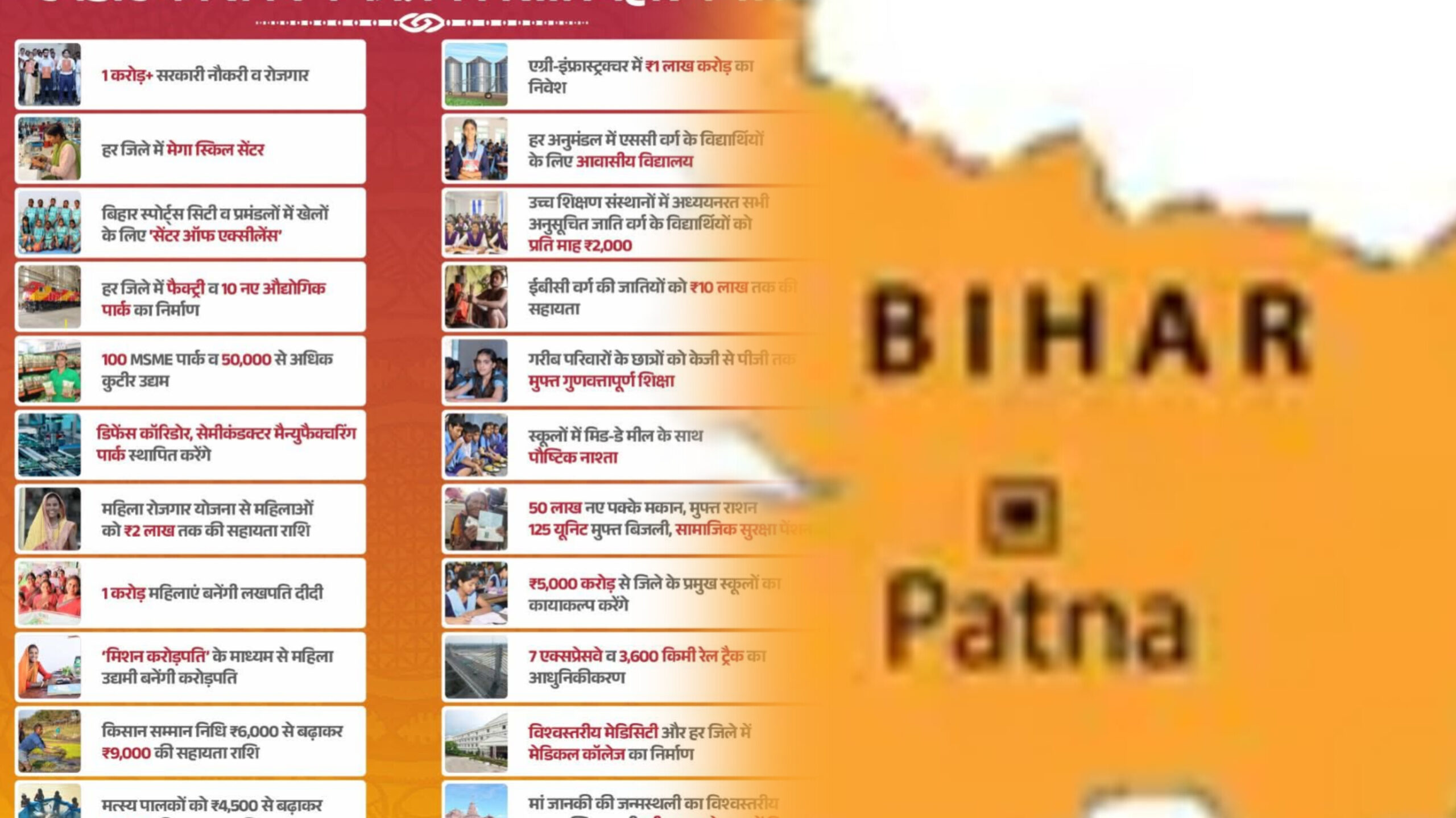 কী নেই এনডিএ জোটের সংকল্প পত্রে। ৫ বছরে ১ কোটির বেশি সরকারী চাকরি কিংবা রোজগার দেওয়ার প্রতিশ্রুতি দেওয়া হয়েছে।দক্ষতা-ভিত্তিক কর্মসংস্থান প্রদানের জন্য একটি স্কিল সেন্সাস পরিচালনা করা এবং প্রতিটি জেলায় মেগা স্কিল সেন্টার স্থাপন করে বিহারকে একটি ‘গ্লোবাল স্কিল ট্রেনিং’ সেন্টারে পরিণত করার প্রতিশ্রুতি দেওয়া হয়েছে। ‘মুখ্যমন্ত্রী মহিলা রোজগার যোজনা’র মাধ্যমে মহিলাদের সমৃদ্ধি ও আত্মনির্ভরশীলতা বাড়াতে ২ লক্ষ টাকা পর্যন্ত আর্থিক সহায়তার প্রতিশ্রুতি দেওয়া হয়েছে। ১ কোটি মহিলাকে ‘লাখপতি দিদি’ বানানোর প্রতিশ্রুতি দিয়েছে।