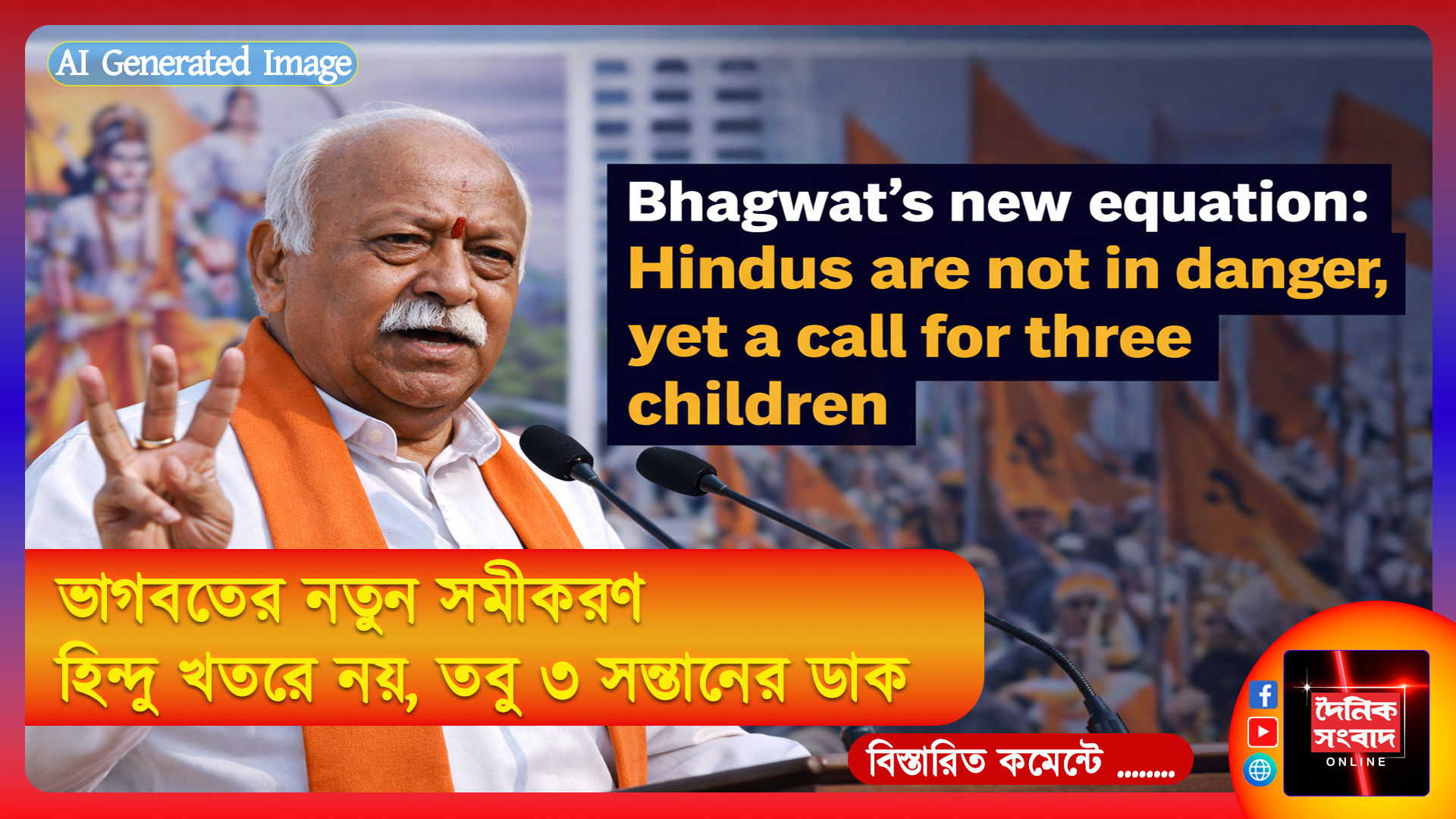 দৈনিক সংবাদ অনলাইন ডেস্ক, ১৮ ফেব্রুয়ারী: হিন্দুরা ঐক্যবদ্ধ হোক। ডাক দিলেন রাষ্ট্রীয় স্বয়ং সেবক সংঘের সরসংঘচালক মোহন ভাগবত। লখনৌয়ের অনুষ্ঠানে তার ঘোষণা ভারত সনাতন ধর্মের ভরকেন্দ্র। তবে সংঘের অন্য শাখাগুলি যেমন যখন তখন ‘হিন্দু খতরে মে হ্যায়’ ঘোষণা করে উচ্চগ্রামে হিন্দুত্ব রাজনীতির জয়গান গেয়ে চলে, সেই পথের বিপরীত মতই প্রকাশ করলেন সরসংঘচালক। কারণ মোহন ভাগবত স্পষ্ট ভাষায় বলেছেন, হিন্দুদের কোনও বিপদ নেই। অর্থাৎ তিনি বলতে চাইলেন, হিন্দু খতরে মে হ্যায়, এটা সঠিক নয়। তিনি বলেছেন, কেউই বিপজ্জনক নয় হিন্দুদের কাছে। তবুও যে দেশ সনাতন ধর্মের প্রাণকেন্দ্র, সেই দেশের হিন্দুরা একজোট হয়ে থাকবে এবং পরস্পরের মধ্যে ঐক্যের এক সৌহার্দ্য বন্ধনে আবদ্ধ হবে এটাই প্রত্যাশিত ও স্বাভাবিক। একইসঙ্গে মোহন ভাগবত আহ্বান করেছেন সব হিন্দুর কাছে যাতে তারা তিন সন্তান নীতিকে গ্রহণ করে। বিজেপির একাধিক এমপি যেখানে বিগত বছরগুলিতে একাধিকবার সংসদের প্রাইভেট মেম্বারস বিল হিসেবে জনসংখ্যা নিয়ন্ত্রণ বিল এনেছেন এবং বিজেপি এমপি ও দলের একাংশের পক্ষ থেকে বারংবার এই দাবিও উঠে যে, জনসংখ্যা নিয়ন্ত্রণ আইন হওয়া দরকার, সেখানে সম্পূর্ণ বিপরীত মত পোষণ করে উল্টে বেশি বেশি সন্তানের পক্ষে সওয়াল করলেন মোহন ভাগবত। কারণ হিসেবে তিনি বলেছেন, ভারতের জনসংখ্যার বৃদ্ধিহার কমে যাচ্ছে অত্যন্ত উদ্বেগজনকভাবে। এভাবে ভবিষ্যতে ভারতও জনসংখ্যা হ্রাসের সংকটে পড়বে। যেভাবে চলছে এভাবেই যদি নতুন প্রজন্মের মধ্যে বিবাহে অনাগ্রহ, সন্তান জন্ম দেওয়া ও প্রতিপালনে কোনও আকর্ষণ না থাকার প্রবণতা দেখা যাচ্ছে, সেটি উদ্বেগজনক এক বার্তা। তাই মোহন ভাগবত বলেছেন, হিন্দুদের নতুন প্রজন্ম ও নব দম্পতিদের কাছে আমাদের বেশি বেশি করে এই বার্তা দিতে হবে যাতে তারা তিন সন্তান নীতি গ্রহণ করে। প্রসঙ্গত চিনে বহু বছর ধরে এক সন্তান নীতি পালিত হওয়ার পর চিনে এখন বেশ কিছু বছর ধরে চলছে জনসংখ্যা হ্রাসের পালা। লক্ষ লক্ষ করে জনসংখ্যা কমে যাচ্ছে প্রতি বছর। চিন, জাপান সহ এশিয়া ও পশ্চিমি দেশগুলিতে। পশ্চিমের বহু দেশে এমন শহরও রয়েছে যেগুলি কার্যত প্রাণহানি। সম্পূর্ণ জনশূন্য হয়ে যাচ্ছে। কারণ সন্তানেরা বাইরে থাকে। বৃদ্ধ বৃদ্ধাদের মৃত্যু হওয়ার পর আর কোনও নতুন প্রজন্ম সেইসব জনপদে থাকতে আসছে না। ভারতের জনসংখ্যা প্রবণতা থেকে মনে করা হচ্ছে ২০৬০ সাল থেকে ভারতের জনসংখ্যা কমতে থাকবে। ২১২১ সালে ভারতের জনসংখ্যা ১১০ কোটি হতে পারে এরকমও মনে করা হয়েছে। মোহন ভাগবত সেই কারণেই বলছেন, এখনই সতর্ক হতে। তাই হিন্দুদের প্রতি তার আহ্বান জনসংখ্যা বৃদ্ধি করুক তারা।