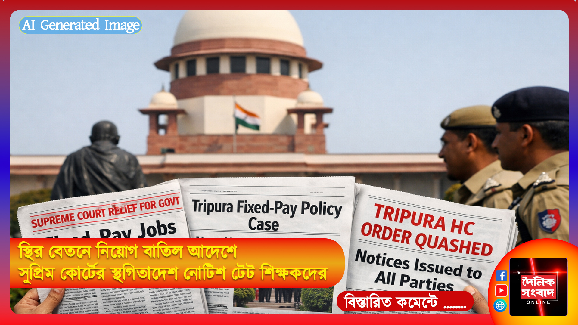 দৈনিক সংবাদ অনলাইন ডেস্ক, ২০ ফেব্রুয়ারী: স্থির বেতনের চাকরি নীতিতে চাকরি বাতিলের রায়ের উপর স্থগিতাদেশ পেলো রাজ্য সরকার। শুক্রবার সুপ্রিম কোর্টের ডিভিশন বেঞ্চ ত্রিপুরা হাইকোর্টের রায়ের উপর স্থগিতাদেশ দিয়ে মামলার সব পক্ষকে নোটিশ দিয়েছে। আগামী ৯ মার্চ মামলার পরবর্তী শুনানির তারিখ রেখেছে দেশের সর্বোচ্চ আদালত। সরকারী চাকরিতে স্থির বেতনে নিয়োগ বন্ধ করতে নির্দেশ দিয়েছিল ত্রিপুরা হাইকোর্ট। হাইকোর্টের প্রধান বিচারপতি এমএস রামাচন্দ্র রাও এবং বিচারপতি বিশ্বজিৎ পাতিলের ডিভিশন বেঞ্চ স্থির বেতনে চাকরি নীতির ২০০১ এবং ২০০৭ সালের বাম আমলের দুটি বিজ্ঞপ্তি বাতিল করে দিয়েছিল। ২০১৮ সালে বিজেপি নির্বাচনের আগে স্থির বেতনের চাকরি তুলে দেওয়ার ঘোষণাও দিয়েছিল। এই নীতির সমালোচনা করেছিলেন বিজেপির অন্য নেতারাও। সম্প্রতি বাম সরকারের আমলে করা স্থির বেতনে চাকরির দুটি বিজ্ঞপ্তি বাতিল করে দিয়েছিল ত্রিপুরা