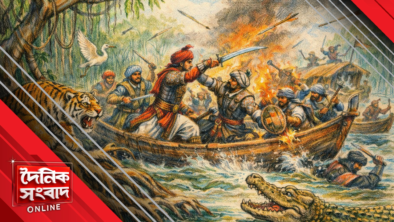 ঈসা খাঁর যুদ্ধক্ষেত্র ছিল ভাটির নদীবুক। প্রতাপাদিত্যের রাজ্য আরো দক্ষিণে — যেখানে ভাগীরথী থেকে মেঘনা পর্যন্ত বিস্তৃত ভূমি সমুদ্রে মেশে। ধুমঘাট ছিল তাঁর প্রধান নৌঘাঁটি — সুন্দরবনের মোহনায়, যেখানে স্থলের মানচিত্র শেষ হয়ে জলের গোলকধাঁধা শুরু হয়। এই ভূগোলে শত্রু দমন হয় দুভাবে — হয় তরবারিতে, নয় পথ হারিয়ে। সুন্দরবনের গহিনে মোগল সেনা দিক হারায়, জোয়ারে ডুবে যাওয়া পথে আটকে পড়ে। গাছের শিকড়, খাঁড়ির বাঁক, জলার কাঁদা, তার উপর বাঘ, সরীসৃপ — এগুলো প্রতাপাদিত্যের মিত্র। মোগলের কাছে এগুলো শুধু বিপদ।