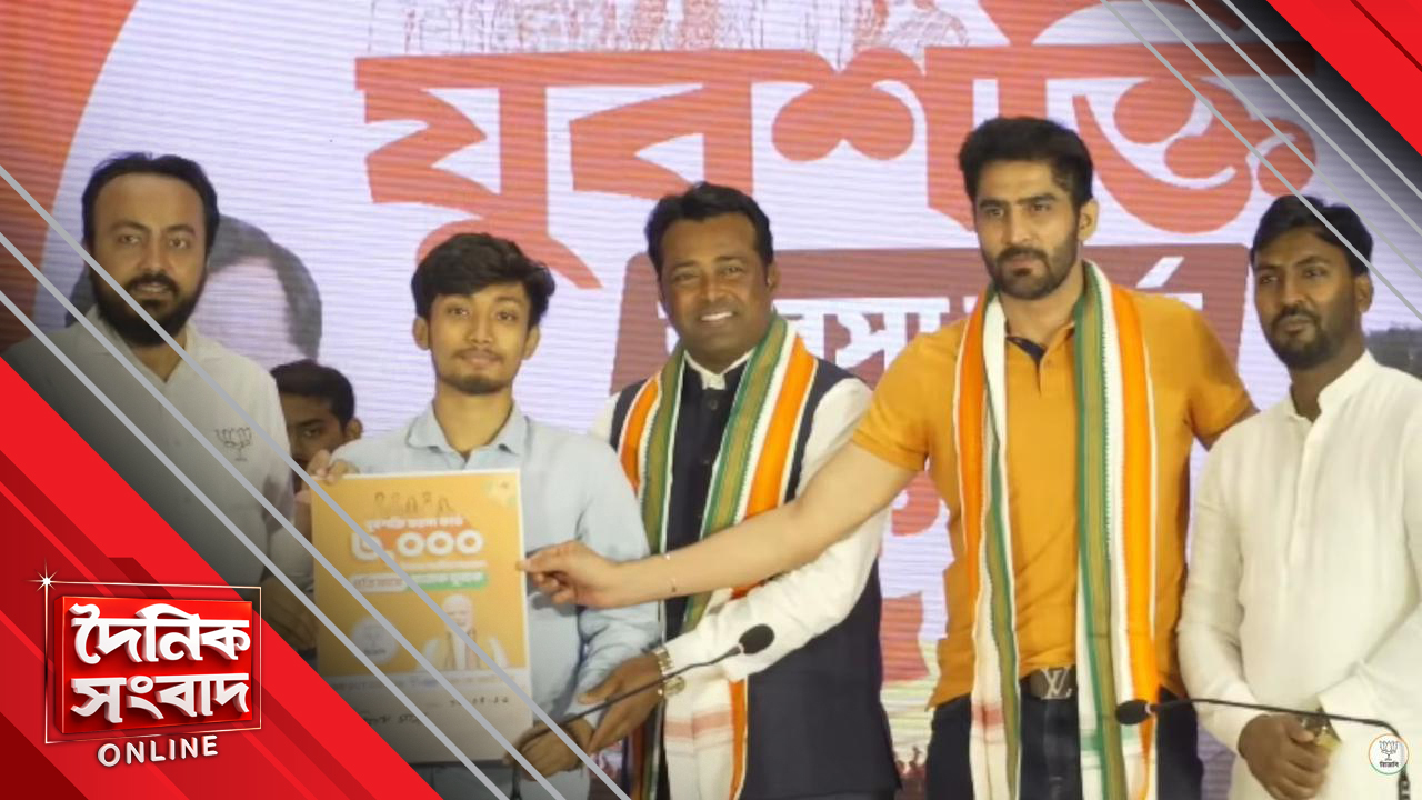 কলকাতা, ১৬ এপ্রিল – বাংলার নারী এবং যুব সম্প্রদায়ের মন জিততে সর্বশক্তি দিয়ে ঝাঁপিয়েছে বিজেপি। তৃণমূল সরকারের লক্ষ্মীর ভাণ্ডার এবং যুবসাথীর পাল্টা নতুন প্রকল্পের কথা ঘোষণা করেছে গেরুয়া শিবির, আর সেইসব প্রকল্পে দ্বিগুণ টাকা দেওয়ারও প্রতিশ্রুতি দেওয়া হয়েছে। বুধবার মহিলাদের হাতে মাসে তিন হাজার টাকার ‘মাতৃশক্তি কার্ড’-এর ঘোষণার পরে বৃহস্পতিবার ‘যুবশক্তি ভরসা’ কার্ড প্রকাশ করল বিজেপি। আর সেই অনুষ্ঠানে হাজির থাকলেন টেনিস তারকা লিয়েন্ডার পেজ এবং বিখ্যাত বক্সার বিজেন্দ্র সিং।